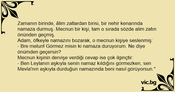 - Ben Leylanın aşkıyla senin namaz kıldığını görmezken, sen Mevla'nın aşkıyla durduğun namazında beni nasıl görüyorsun."