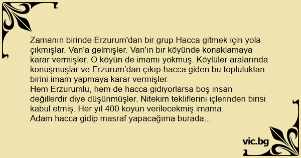 Zamanın birinde Erzurum'dan bir grup Hacca gitmek için yola çıkmışlar. Van'a gelmişler. Van'ın bir köyünde konaklamaya karar vermişler. O köyün de imamı yokmuş. Köylüler aralarında konuşmuşlar ve Erzurum’dan çıkıp hacca giden bu topluluktan birini imam yapmaya karar vermişler.