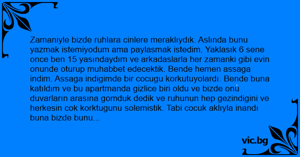 Zamaniyle bizde ruhlara cinlere meraklıydık. Aslında bunu yazmak istemiyodum ama paylasmak istedim. Yaklasık 6 sene once ben 15 yasındaydım ve arkadaslarla her zamanki gibi evin onunde oturup muhabbet edecektik. Bende hemen assaga indim. Assaga indigimde bir cocugu korkutuyolardı. Bende buna katıldım ve bu apartmanda gizlice biri oldu ve bizde onu duvarların arasına gomduk dedik ve ruhunun hep gezindigini ve herkesin сок korktugunu solemistik. Tabi cocuk aklıyla inandı buna bizde bunu korkutmaya calısıyoruz. Bunlar evin arkadasında yururlerken ben dısarı cıkardıgım muzik setinin kolonlarıyla mikrofon dan cıkardıgım garip garip sesleri assagıdakilere dinletiyorum. Cocuk olesine korkmustuki bunu bilmeyen baska cocuklarda buna inanmaya baslamıstı. Bizde bunun devam etmesi icin yan blogun bodrum katına bir yer hazırladık ve sanki insan olusu varmıs gibi duruyodu arkadaslarda duvarların arkasından yerlere cam lar atıyoar icerde cıkan sesler yankılanıyodu. Artık butun mahallenin cocukları buna inanmıstı. Hepsi olamaz bole bir sey diyodu. Sonunda bir aksilik cıkmadan aksamı getirmistik. Bu arkadaslardan bir grubu yine assaga ineceklerdi. İnanmıslardı ama gece ne olacagını merak ediyolardı. Gece biz bunların buraya gidecegini ogrendik ve arkadaslarla bir sey yapamayacagımız icin kara kara dusunmeye basladık cunku oyunumuz ortaya cıkacaktı. Cardakta oturuyoduk o sırada kapkara bir sey onumuzden gecti biz ya kedi ya kopek dedik bunun icin. En sonunda karar aldık. Gizli saklanma yerimize gidecektik. Bu bos bir evdi apartmanın zemin katı panjurdan giriyoduk. Eve girmistik Isıkları acmaya calsıtık ama yanmadı ve birden onumuzden yine o siyah sey gecti. İnanamamıstık kedi degildi kopek olsa saldırırdı. Сок urkmustuk. O sırada cıglıklarla arkadasları bizi aramaya basladılar biz bize bir oyun oynadıklarını dusunduk. Fakat oyun degilmis Assaga indiklerinde bodrumun ısık alan camları kırılmaya baslamıs ve duvarların icinden sesler gelmeye baslamıs. Bizde buna inanmayıp assaga indik. Ve gordugumuz sey sonunda bizide korkutmutu. Orada bir sey ler fazla idi ve bunu bir insan bizden habersiz yapamazdı anahtarlar bizde idi. Oradaki masa ve bıcak. Resmen kanlıydı ve o sırada iceriden dısarıya yine o siyah sey cıktı. Artık altımıza dolduracaktık. kactık en iyisi herkezin evlerine gitmesiydi. Evlere gittik. Ben durmadan dua ediyodum. En sonunda anneannem bizde kaldıgı icin bende salonda yatacagımdan esyalarımı aldım ve salona gittim. Uyumak icin gozlerimi kaptıgımda bir ses duyuyodum. Bunlar sanki birinin bana dogru yurudugu sanki yaklastıgı gibi ayak sesleriydi gozumu actım ve sesler kesildi. Tekrar gozumu kapdıgımda yine bana bir sey ler yaklasıyo gibiydi ama сок hızlı sekilde gozumu actık. Dayanamıyodum cıglık atacaktım en sonunda bildigim butun dua ları okudum ve uyudum. Fakat cagre etmedi resmen icimden bir ses kesinlikle dua etme ve gozunu acma diyodu. Dayanamamıstım birden cıglıkla kalktım ve iceriye kostum. O gun abimin yanında yattım. Fakat oburgun uyandıgımda bulusma yerinde bir seyler olmustu. Sabah o ısık girmeyen evde onlarca göz ve insan golgesi sesler duymuslardı. Hepimiz delirmis gibiydik. İyilesene kadar cıkamadık bir yere. Sondan biz bu oyunu yaptıgımızda birilerinin ruh cagordıgını ogrendik. ve bir daha bole bir sey yapmamaya soz verdim.