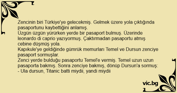 Zencinin biri Amerika'dan Türkiye'ye gelecekmiş. Yola çıktığında pasaportunu kaybettiğini anlamış. Uçağı kaçırma korkusuyla kara kara düşünürken yolda bir pasaport bulmuş. Bir bakmış ki Titanik...