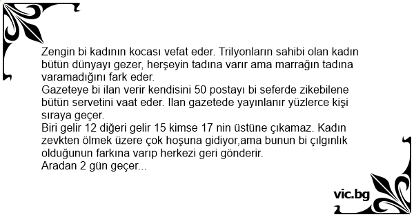 Aradan 2 gün geçer eski gazeteyi karıştıran bi adana lı birol adında biri ilanı görür ve adrese gider. Kapıyı çalar kadın karşısındaki birol a sorar ne vardı. Adam der ben ilan için geldim kadın tebessümle peki sanada bi şans vericem der.