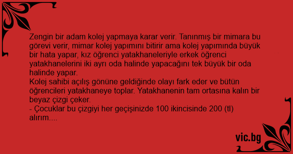 Zengin bir adam kolej yapmaya karar verir. Tanınmış bir mimara bu görevi verir, mimar kolej yapımını bitirir ama kolej yapımında büyük bir hata yapar, kız öğrenci yatakhaneleriyle erkek öğrenci yatakhanelerini iki ayrı oda halinde yapacağını tek büyük bir oda halinde yapar.