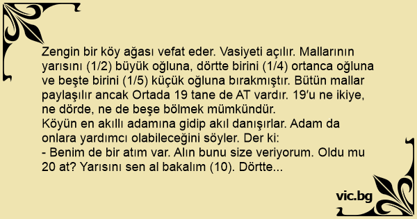 Zengin bir köy ağası vefat eder. Vasiyeti açılır. Mallarının yarısını (1/2) büyük oğluna, dörtte birini (1/4) ortanca oğluna ve beşte birini (1/5) küçük oğluna bırakmıştır. Bütün mallar paylaşılır ancak Ortada 19 tane de AT vardır. 19′u ne ikiye, ne dörde, ne de beşe bölmek mümkündür.