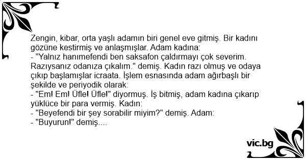 - "Yalnız hanımefendi ben saksafon çaldırmayı çok severim. Razıysanız odanıza çıkalım." demiş. Kadın razı olmuş ve odaya çıkıp başlamışlar icraata. İşlem esnasında adam ağırbaşlı bir şekilde ve periyodik olarak: