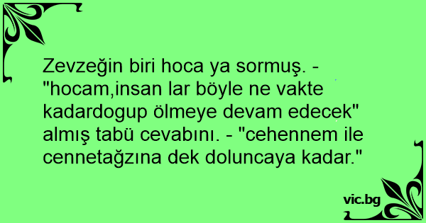 Zevzeğin biri hoca ya sormuş. - "hocam,insan lar böyle ne vakte kadardogup ölmeye devam edecek" almış tabü cevabını. - "cehennem ile cennetağzına dek doluncaya kadar."