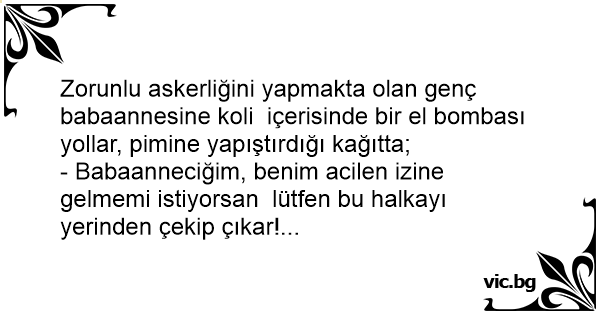 Zorunlu askerliğini yapmakta olan genç babaannesine koli içerisinde bir el bombası yollar, pimine yapıştırdığı kağıtta;