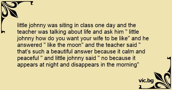 little johnny was siting in class one day and the teacher was talking about life and ask him " little johnny how do you want your wife to be like" and he answered " like the moon" and the teacher said " that’s such a beautiful answer because it calm and peaceful " and little johnny said " no because it appears at night and disappears in the morning"