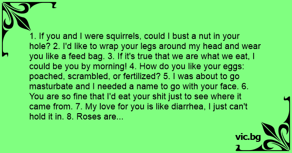 1. If you and I were squirrels, could I bust a nut in your hole? 2. I'd like to wrap your legs around my head and wear you like a feed bag. 3. If it's true that we are what we eat, I could be you by morning! 4. How do you like your eggs: poached, scrambled, or fertilized? 5. I was about to go маsтurвате and I needed a name to go with your face. 6. You are so fine that I'd eat your shiт just to see where it came from. 7. My love for you is like diarrhea, I just can't hold it in. 8. Roses are red. Violets are blue. I like spaghetti. Let's go fuск. 9. Is that a keg in your pants? 'Cause I would love to tap that аss! 10. If your right leg was Thanksgiving, and your left leg was Christmas, could I meet you between the holidays? 11. You remind me of a championship bass, I don't know whether to mount you or eat you! 12. Your parents must be rетаrdеd, because you are special. 13. Could I touch your belly button . . . from the inside? 14. I'm not too good at algebra, but doesn't U+I = 69? 15. How about we play lion and lion tamer? You hold your mouth open, and I'll give you the meat. 16. Guy: