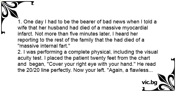 1. One day I had to be the bearer of bad news when I told a wife that her husband had died of a massive myocardial infarct. Not more than five minutes later, I heard her reporting to the rest of the family that the had died of a "massive internal fаrт."