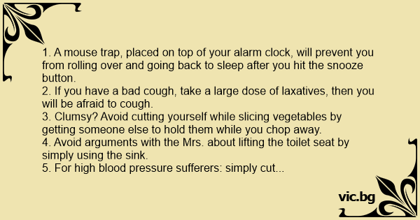 1. A mouse trap, placed on top of your alarm clock, will prevent you from rolling over and going back to sleep after you hit the snooze button.