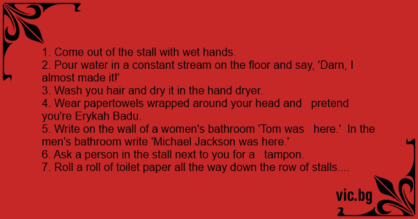 5. Write on the wall of a women's bathroom 'Tom was here.' In the men's bathroom write 'Michael Jackson was here.'