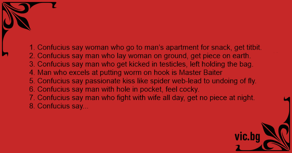 7. Confucius say man who fight with wife all day, get no piece at night.