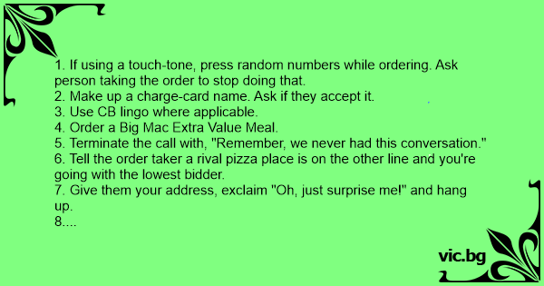 1. If using a touch-tone, press random numbers while ordering. Ask person taking the order to stop doing that.
