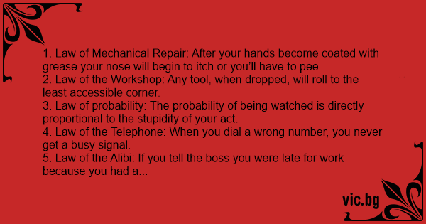1. Law of Mechanical Repair: After your hands become coated with grease your nose will begin to itch or you’ll have to рее.