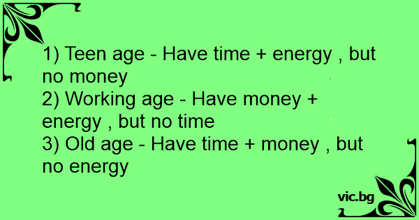 1) Teen age - Have time + energy , but no money