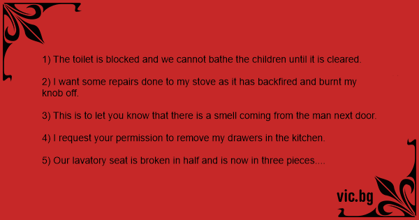 6) Will you please send someone to mend our cracked sidewalk? Yesterday my wife tripped on it and is now pregnant.