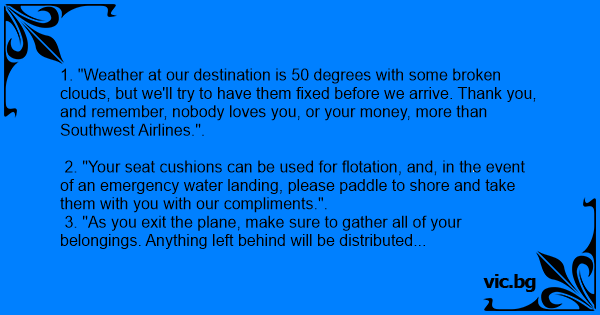 1. "Weather at our destination is 50 degrees with some broken clouds, but we'll try to have them fixed before we arrive. Thank you, and remember, nobody loves you, or your money, more than Southwest Airlines.".