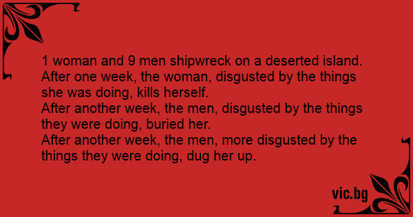 30 de bărbaţi şi o femeie naufragiază pe o insulă pustie. După 30 de zile, femeia, scîrbită de ce făcea, se sinucide. După alte 30 de zile, bărbaţii, scîrbiţi de ce făceau, o îngroapă. După alte 30...