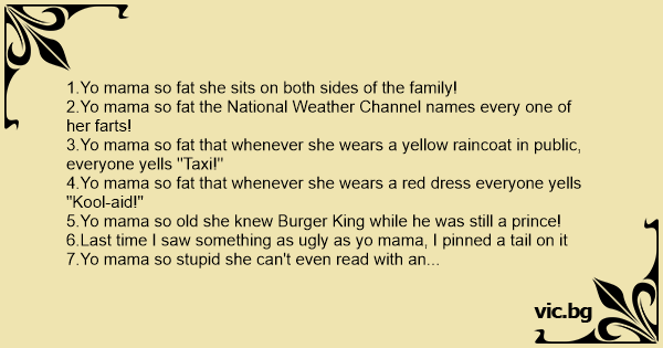 1.Yo mama so fат she sits on both sides of the family! 2.Yo mama so fат the National Weather Channel names every one of her farts! 3.Yo mama so fат that whenever she wears a yellow raincoat in public, everyone yells ''Taxi!'' 4.Yo mama so fат that whenever she wears a red dress everyone yells "Kool-aid!" 5.Yo mama so old she knew Burger King while he was still a prince! 6.Last time I saw something as ugly as yo mama, I pinned a tail on it 7.Yo mama so sтuрid she can't even read with an audio book! 8.Yo mama so ugly her birth certificate contains an apology letter! 9.Yo mama so fат that when she fell in love, she broke it! 10.Yo mama so fат she can't even stop to a conclusion! 11.Yo mama so fат her nickname is "DАМN!" 12.Yo mama so fат she was born on the 4th, 5th, and 6th of June! 13.Yo mama so fат she doesn't eat with a fork... she eats with a forklift!