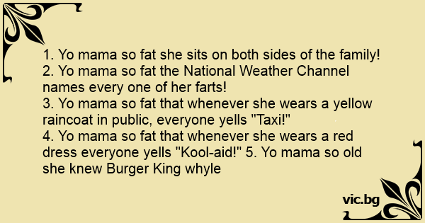 4. Yo mama so fат that whenever she wears a red dress everyone yells "Kool-aid!" 5. Yo mama so old she knew Burger King whyle