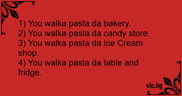 1) You walka pasta da bakery.