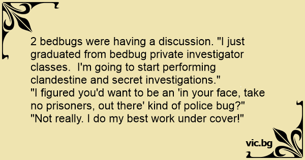 2 bedbugs were having a discussion. "I just graduated from bedbug private investigator classes. I'm going to start performing clandestine and secret investigations."