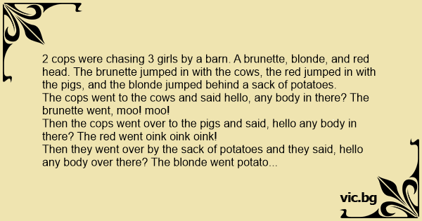 2 cops were chasing 3 girls by a barn. A brunette, blonde, and red head. The brunette jumped in with the cows, the red jumped in with the pigs, and the blonde jumped behind a sack of potatoes.