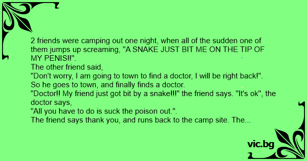 2 friends were camping out one night, when all of the sudden one of them jumps up screaming, "A SNAKE JUST BIT ME ON THE TIP OF MY РЕNIS!!".