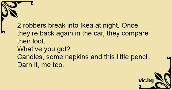 2 robbers break into Ikea at night. Once they’re back again in the car, they compare their loot: