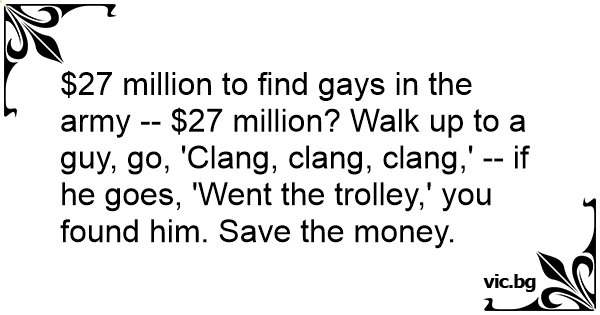 $27 million to find gаys in the army -- $27 million? Walk up to a guy, go, 'Clang, clang, clang,' -- if he goes, 'Went the trolley,' you found him. Save the money.
