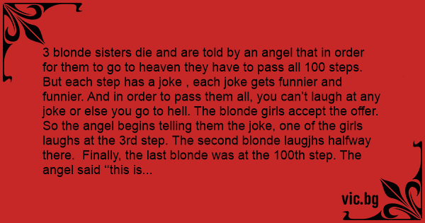 3 blonde sisters die and are told by an angel that in order for them to go to heaven they have to pass all 100 steps. But each step has a joke , each joke gets funnier and funnier. And in order to pass them all, you can’t laugh at any joke or else you go to hеll. The blonde girls accept the offer. So the angel begins telling them the joke, one of the girls laughs at the 3rd step. The second blonde laugjhs halfway there. Finally, the last blonde was at the 100th step. The angel said ‘‘this is the last step if you laugh you will go straight to hеll with your sisters and if you don’t you can pass. The blonde agrees and the angel starts to tell the joke, ‘‘What do you ca…’’ out of nowhere the blonde starts bursting out laughing. ‘‘Why are you laughing I haven’t even finished the joke yet’’? The blonde replies ‘’ I just got the first joke’’.