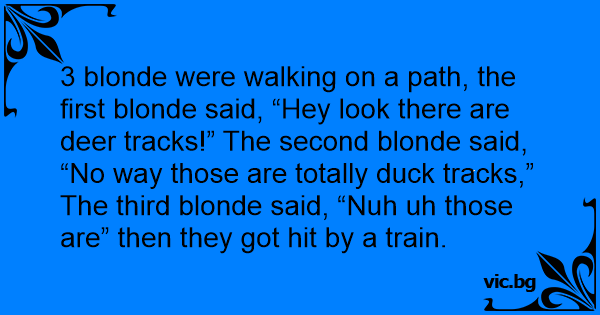 3 blonde were walking on a path, the first blonde said, “Hey look there are deer tracks!” The second blonde said, “No way those are totally duck tracks,” The third blonde said, “Nuh uh those are” then they got hit by a train.