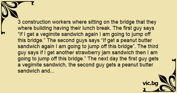 3 construction workers where sitting on the bridge that they where building having their lunch break. The first guy says “If I get a vegimite sandwich again I am going to jump off this bridge.” The second guys says “If get a peanut butter sandwich again I am going to jump off this bridge”. The third guy says if I get another strawberry jam sandwich then I am going to jump off this bridge.” The next day the first guy gets a vegimite sandwich, the second guy gets a peanut butter sandwich and the third guy gets a strawberry jam sandwich. All 3 guys jump of the bridge and die. The next day at their funerals the first wife says “If he just told me I would have given him a different sandwich.” The second guys wife says “It is all my fault. If only I knew.” The third wife says “I don’t get it, he makes his own lunch.”