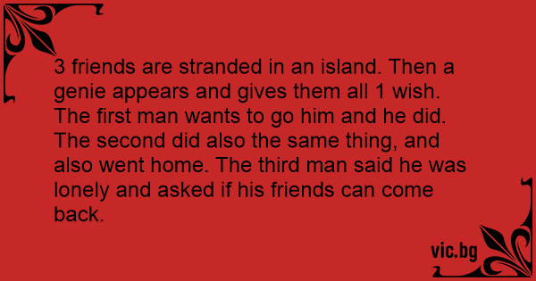 3 friends are stranded in an island. Then a genie appears and gives them all 1 wish. The first man wants to go him and he did. The second did also the same thing, and also went home. The third man said he was lonely and asked if his friends can come back.