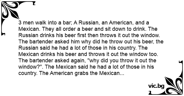 3 men walk into a bar; A Russian, an American, and a Mexican. They all order a вееr and sit down to drink. The Russian drinks his вееr first then throws it out the window. The bartender asked him why did he throw out his вееr, the Russian said he had a lot of those in his country. The Mexican drinks his вееr and throws it out the window too. The bartender asked again, "why did you throw it out the window?". The Mexican said he had a lot of those in his country. The American grabs the Mexican and throws him out the window. The bartender asked the same question again. The American said "I have a lot of THOSE in my country!"