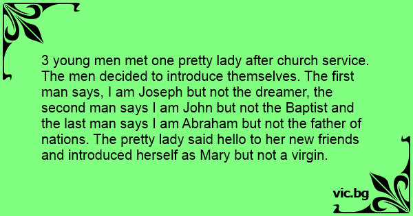 3 young men met one pretty lady after church service. The men decided to introduce themselves. The first man says, I am Joseph but not the dreamer, the second man says I am John but not the Baptist and the last man says I am Abraham but not the father of nations. The pretty lady said hello to her new friends and introduced herself as Mary but not a virgin.