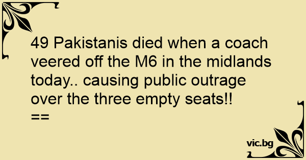 49 Pakistanis died when a coach veered off the M6 in the midlands today.. causing public outrage over the three empty seats!!