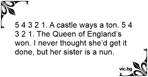 5 4 3 2 1. A castle ways a ton. 5 4 3 2 1. The Queen of England’s won. I never thought she’d get it done, but her sister is a nun.