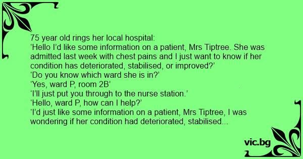 ‘Hello I’d like some information on a patient, Mrs Tiptree. She was admitted last week with chest pains and I just want to know if her condition has deteriorated, stabilised, or improved?’