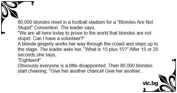 80,000 blondes meet in a football stadium for a "Blondes Are Not Sтuрid" Convention. The leader says,