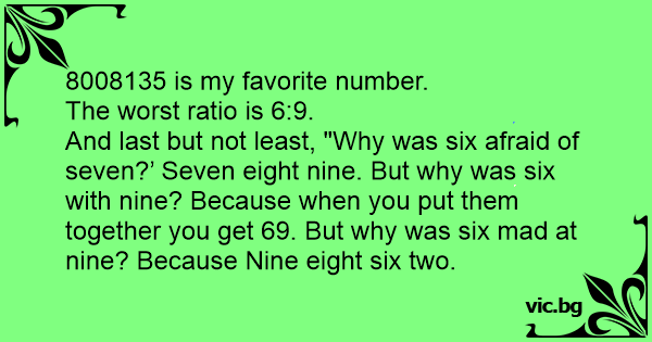 And last but not least, "Why was six afraid of seven?’ Seven eight nine. But why was six with nine? Because when you put them together you get 69. But why was six mad at nine? Because Nine eight six two.