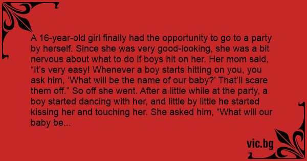 Младо момиче (гимназистка) се подготвя да отива на купон за първи път. Майка и я съветва: - Ще има много нахални момчета там. Ще потанцувате ще пийнете и те ще кажат "Хайде да отидем в другата стая!". Като ти кажат така ти казвай
