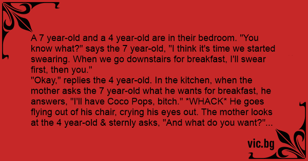 "Okay," replies the 4 year-old. In the kitchen, when the mother asks the 7 year-old what he wants for breakfast, he answers, "I'll have Coco Pops, вiтсh." *WHACK* He goes flying out of his chair, crying his eyes out. The mother looks at the 4 year-old & sternly asks, "And what do you want?"