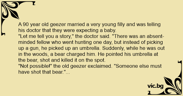 A 90 year old geezer married a very young filly and was telling his doctor that they were expecting a baby.