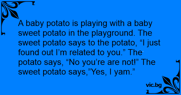 A baby potato is playing with a baby sweet potato in the playground. The sweet potato says to the potato, “I just found out I’m related to you.” The potato says, “No you’re are not!” The sweet potato says,”Yes, I yam.”
