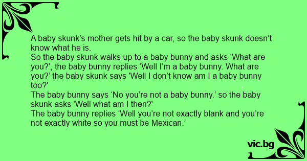 So the baby skunk walks up to a baby bunny and asks ‘What are you?’, the baby bunny replies ‘Well I’m a baby bunny. What are you?’ the baby skunk says 'Well I don’t know am I a baby bunny too?'