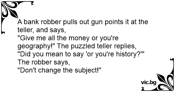 "Give me all the money or you're geography!" The puzzled teller replies,