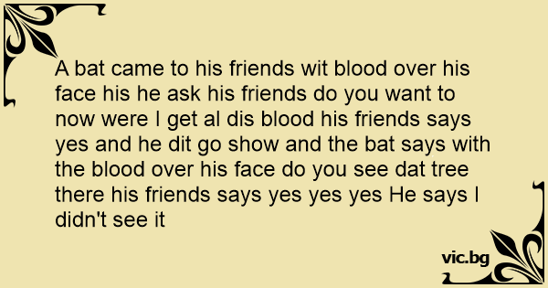 A bat came to his friends wit blood over his face his he ask his friends do you want to now were I get al dis blood his friends says yes and he dit go show and the bat says with the blood over his face do you see dat tree there his friends says yes yes yes He says I didn't see it