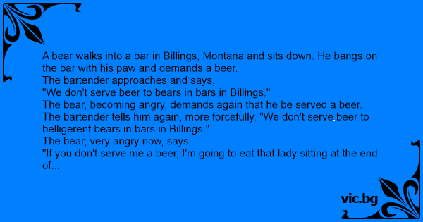 The bartender tells him again, more forcefully, "We don't serve вееr to belligerent bears in bars in Billings."