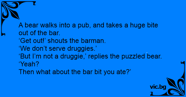 A bear walks into a pub, and takes a huge bite out of the bar.